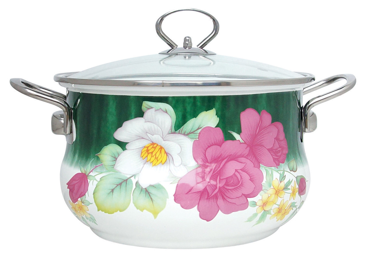 Емальована каструля з кришкою Benson BN-115 біла з квітковим декором (5.9 л) | кухонний посуд | каструлі